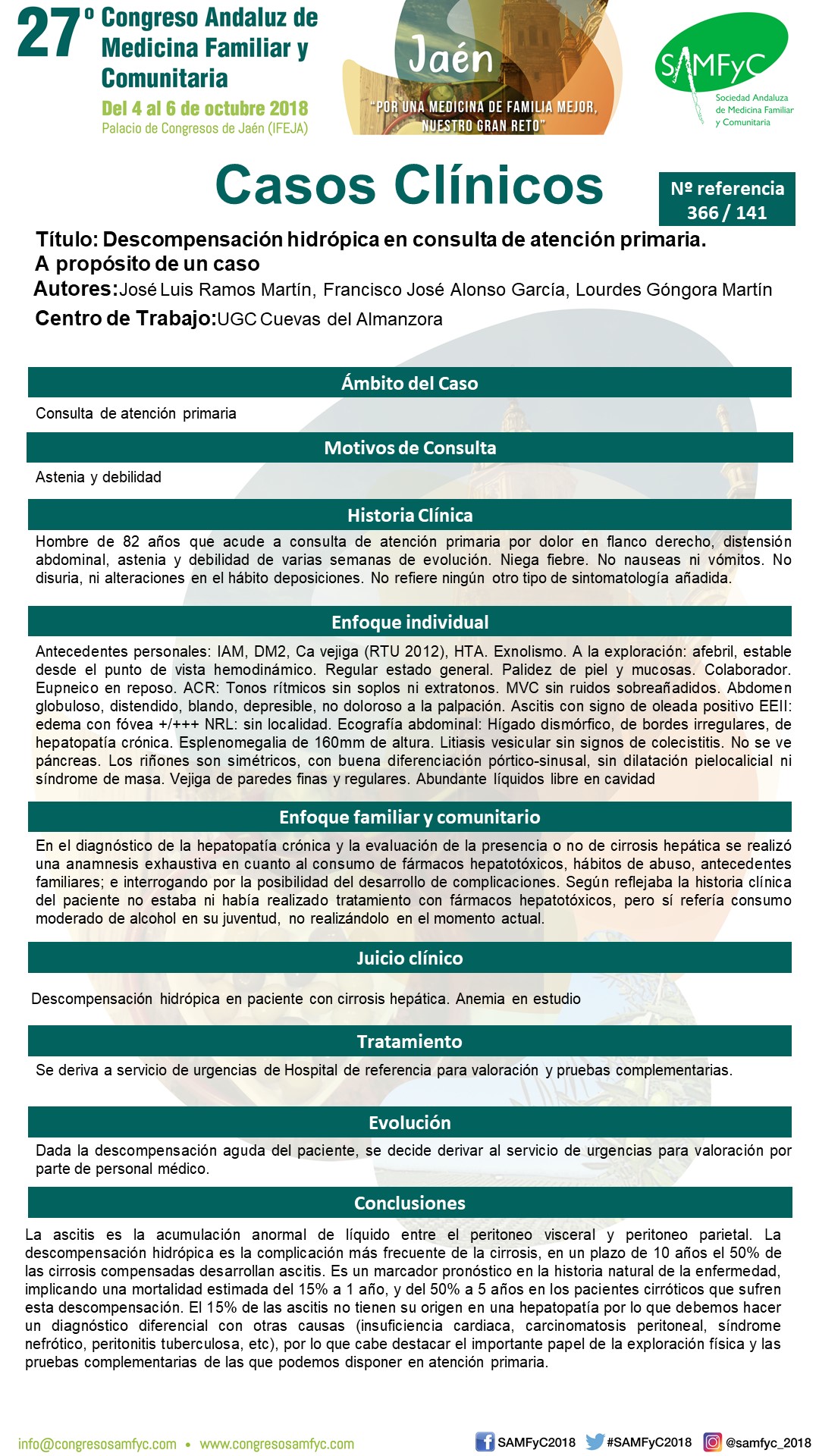 Antecedentes personales: IAM, DM2, Ca vejiga (RTU 2012), HTA. Exnolismo. A la exploración: afebril, estable desde el punto de vista hemodinámico. Regular estado general. Palidez de piel y mucosas. Colaborador. Eupneico en reposo. ACR: Tonos rítmicos sin soplos ni extratonos. MVC sin ruidos sobreañadidos. Abdomen globuloso, distendido, blando, depresible, no doloroso a la palpación. Ascitis con signo de oleada positivo EEII: edema con fóvea +/+++ NRL: sin localidad. Ecografía abdominal: Hígado dismórfico, de bordes irregulares, de hepatopatía crónica. Esplenomegalia de 160mm de altura. Litiasis vesicular sin signos de colecistitis. No se ve páncreas. Los riñones son simétricos, con buena diferenciación pórtico-sinusal, sin dilatación pielocalicial ni síndrome de masa. Vejiga de paredes finas y regulares. Abundante líquidos libre en cavidad.