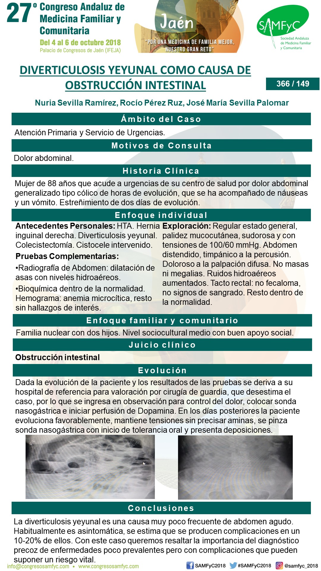 La diverticulosis yeyunal es una causa muy poco frecuente de abdomen agudo. Habitualmente es asintomática, se estima que se producen complicaciones en un 10-20% de ellos. Con este caso queremos resaltar la importancia del diagnóstico precoz de enfermedades poco prevalentes pero con complicaciones que pueden suponer un riesgo vital.
