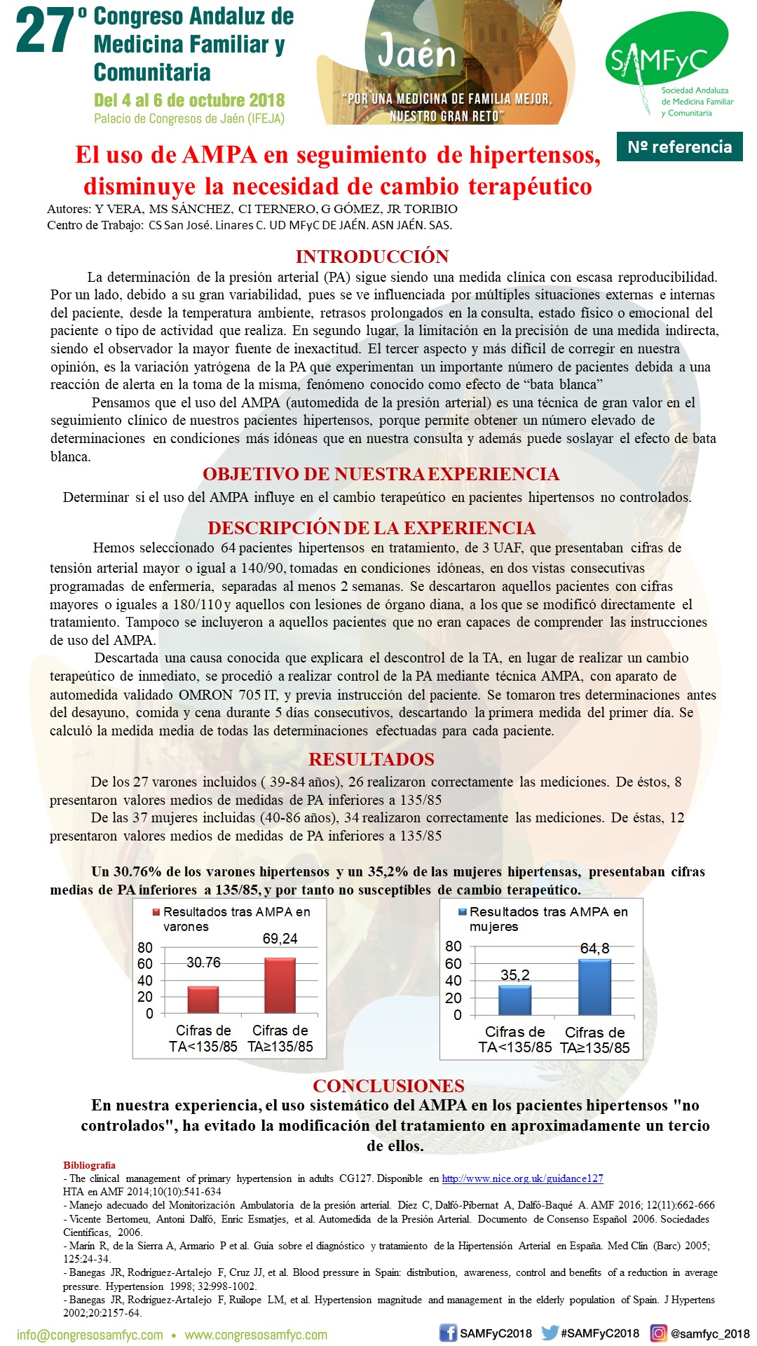 Un 30,76 % de los varones hipertensos y un 35,2% de las mujeres hipertensas, presentaban cifras medias de PA inferiores a 135/85, y por tanto no susceptibles de cambio terapeútico. De el total de los 60 pacientes hipertensos considerados “no controlados” en consulta de enfermería, el 33,3% presentaron cifras de control de TA (<135/85) con medidas AMPA.