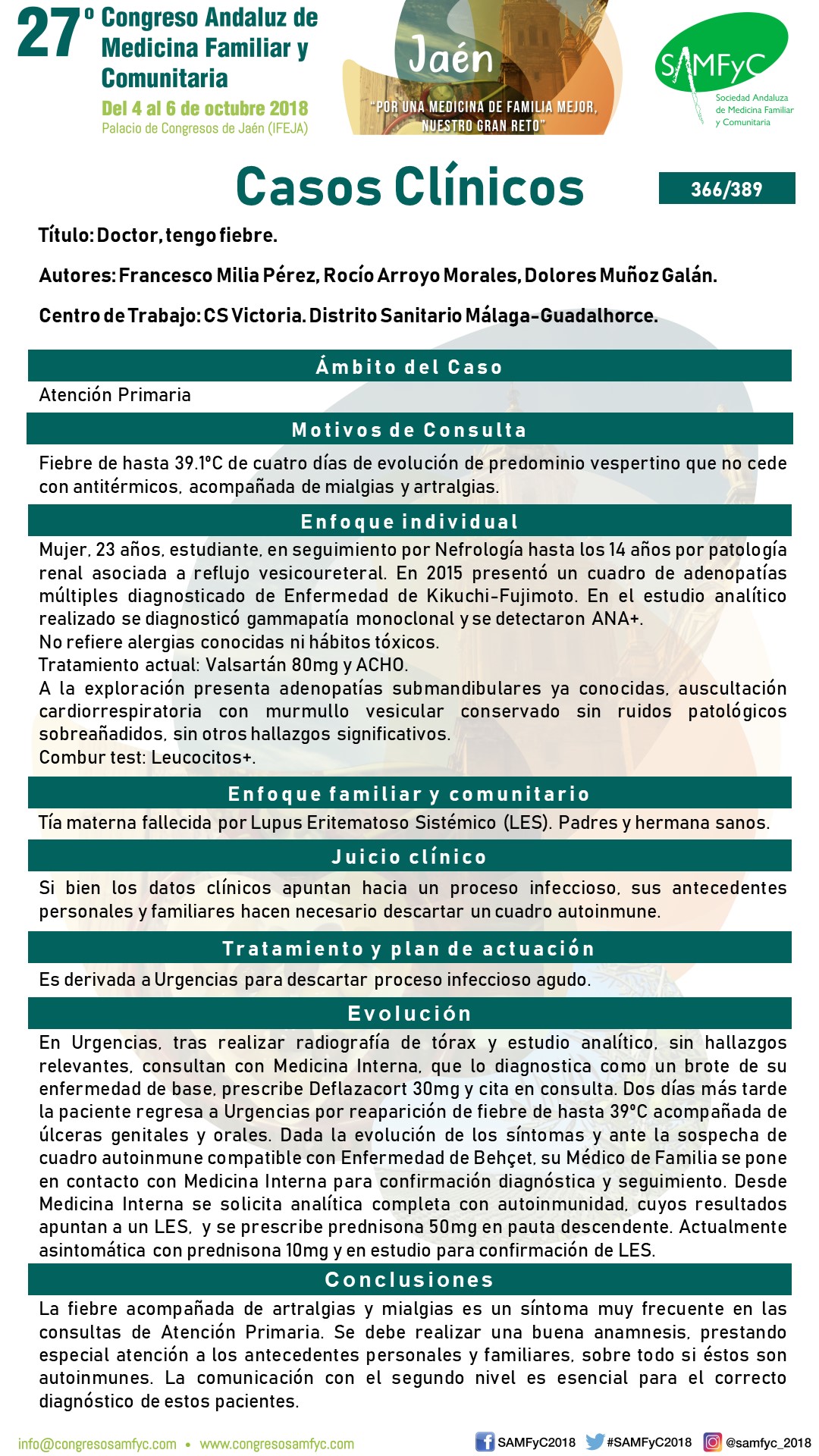La fiebre acompañada de artralgias y mialgias es un síntoma muy frecuente en las consultas de Atención Primaria. Se debe realizar una buena anamnesis, prestando especial atención a los antecedentes personales y familiares, sobre todo si éstos son autoinmunes. La comunicación con el segundo nivel es esencial para el correcto diagnóstico de estos pacientes.