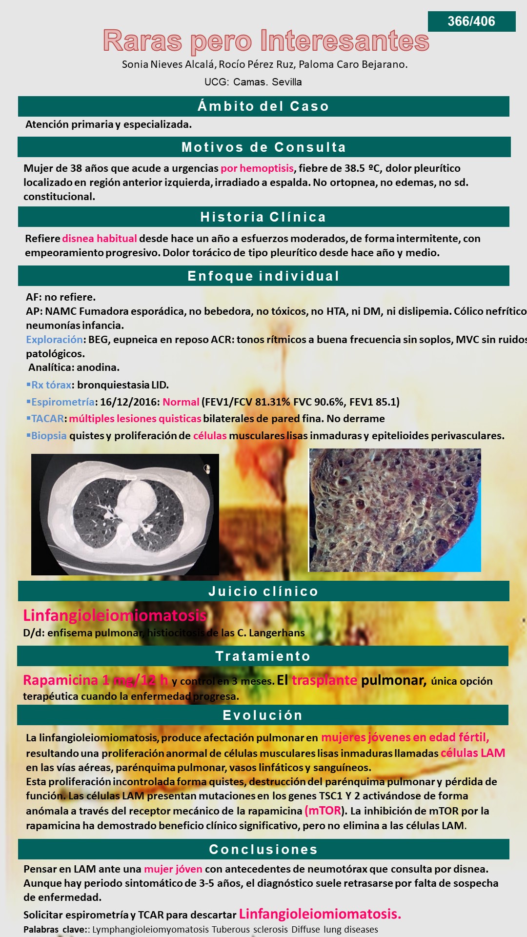 La linfangioleiomiomatosis, produce una fectación pulmonar en mujeres jóvenes en edad fértil. resultando una proliferación anormal de células musculares lisas inmaduras llamadas células LAM en las vías aéreas, parénquima pulmonar, vasos linfáticos y sanguíneos. Esta proliferación incontrolada forma quistes, destrucción del parénquima pulmonar y pérdida de función. Las células LAM presentan mutaciones en los genes TSC1 Y 2 activandose de forma anomala a través del receptor mecánico de la rapamicina (mTOR). La inhibición de mTOR por la rapamicina ha demostrado beneficio clínico significativo, pero no elimina a las células LAM.
