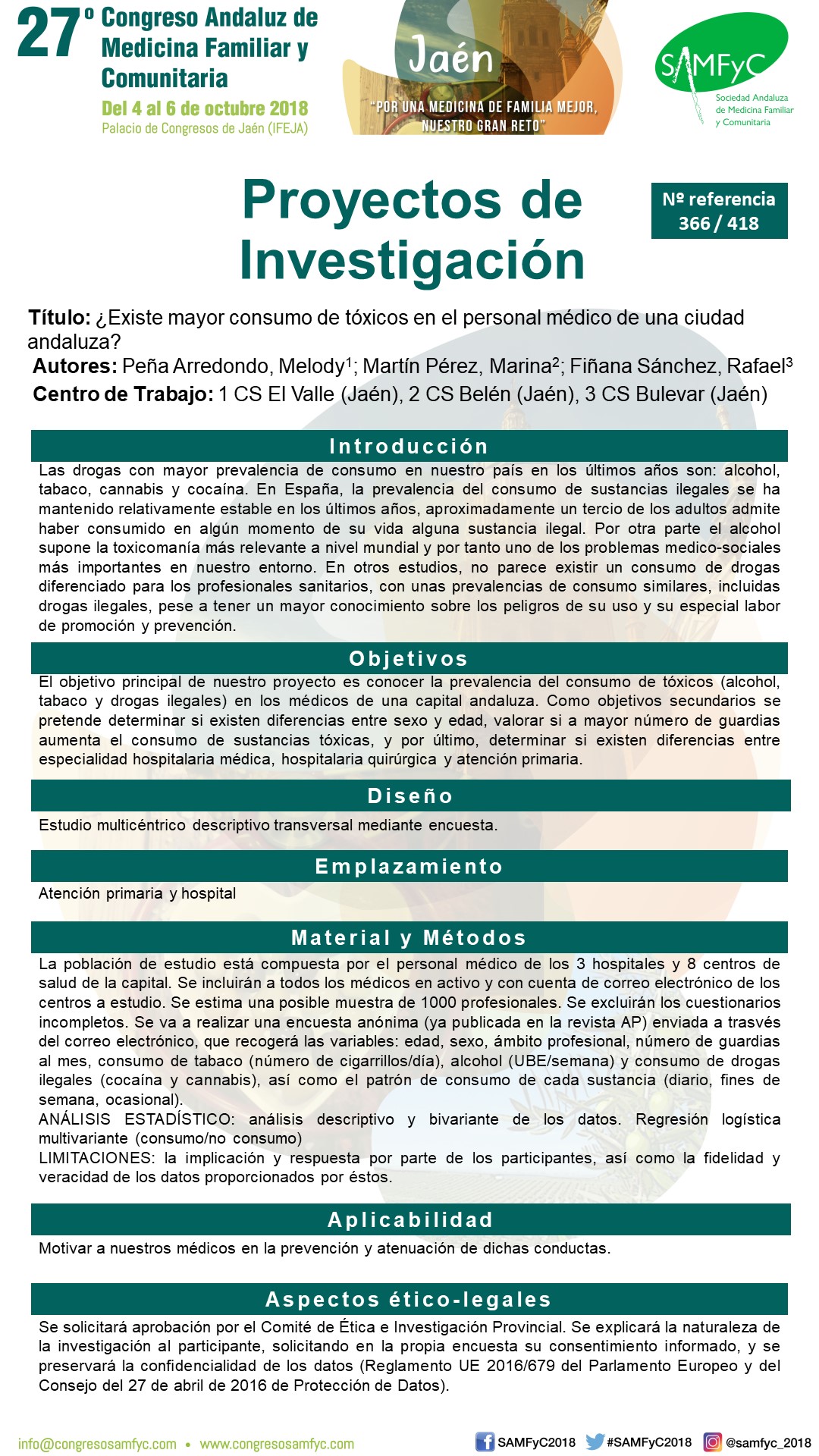 El objetivo principal de nuestro proyecto es conocer la prevalencia del consumo de tóxicos (alcohol, tabaco y drogas ilegales) en los médicos de una capital andaluza. Como objetivos secundarios se pretende determinar si existen diferencias entre sexo y edad, valorar si a mayor número de guardias aumenta el consumo de sustancias tóxicas, y por último, determinar si existen diferencias entre especialidad hospitalaria médica, hospitalaria quirúrgica y atención primaria.