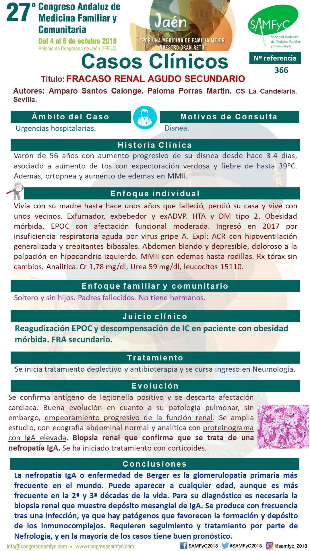 Se confirma antígeno de legionella positivo y se descarta afectación cardiaca. Buena evolución en cuanto a su patología pulmonar, sin embargo, empeoramiento progresivo de la función renal. Se decide traslado a Nefrología. Se amplía estudio, con ecografía abdominal normal y analítica con proteinograma con IgA elevada. Biopsia renal que confirma que se trata de una nefropatía IgA. Se ha iniciado tratamiento con corticoides.