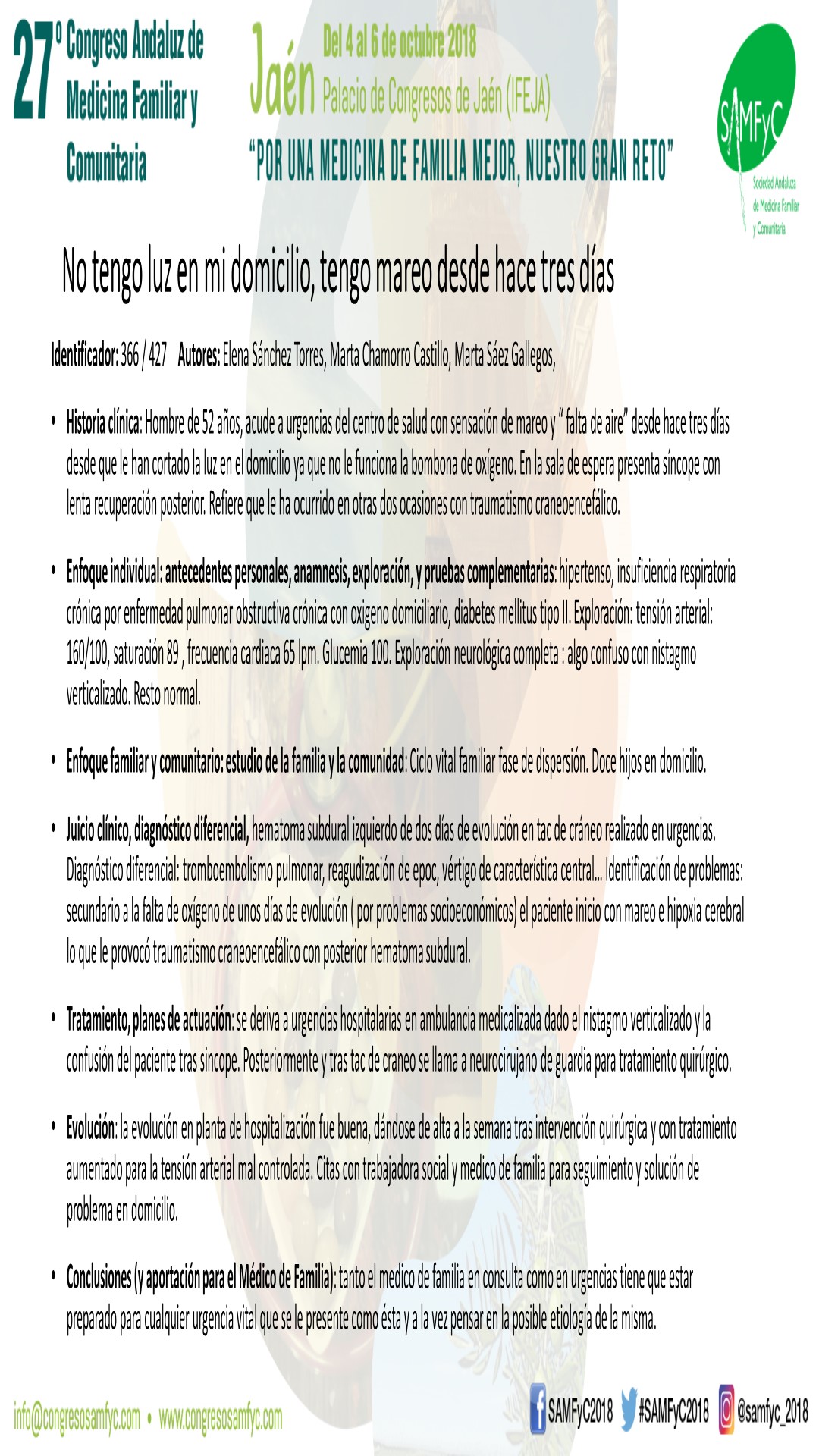 Hombre de 52 años, acude a urgencias del centro de salud con sensación de mareo y “ falta de aire ” desde hace tres días desde que le han cortado la luz en el domicilio ya que no le funciona la bombona de oxígeno. En la sala de espera presenta síncope con lenta recuperación posterior. Refiere que le ha ocurrido en otras dos ocasiones con traumatismo craneoencefálico.