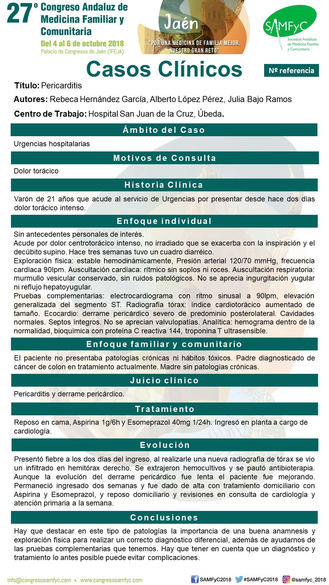 Antecedentes personales: sin patologías crónicas ni tratamiento habitual. Acude por dolor centrotorácico intenso, no irradiado que se exacerba con la inspiración y el decúbito supino. Hace unas tres semanas tuvo un cuadro diarréico. Exploración física: estable hemodinámicamente, Presión arterial 120/70 mmHg, frecuencia cardíaca 90lpm. Auscultación cardíaco: rítmico sin soplos ni roces. Auscultación respiratoria: murmullo vesicular conservado, sin ruidos patológicos. No se aprecia ingurgitación yugular ni reflujo hepatoyugular. Pruebas complementarias: electrocardiograma con ritmo sinusal a 90lpm, elevación generalizada del segmento ST. Radiografía tórax: índice cardiotorácico aumentado de tamaño. Ecocardio: derrame pericárdico severo de predominio posterolateral. Cavidades normales. Septos íntegros. No se aprecian valvulopatías. Analítica: hemograma dentro de la normalidad, bioquímica con proteína C reactiva 144, troponina T ultrasensible 3.
