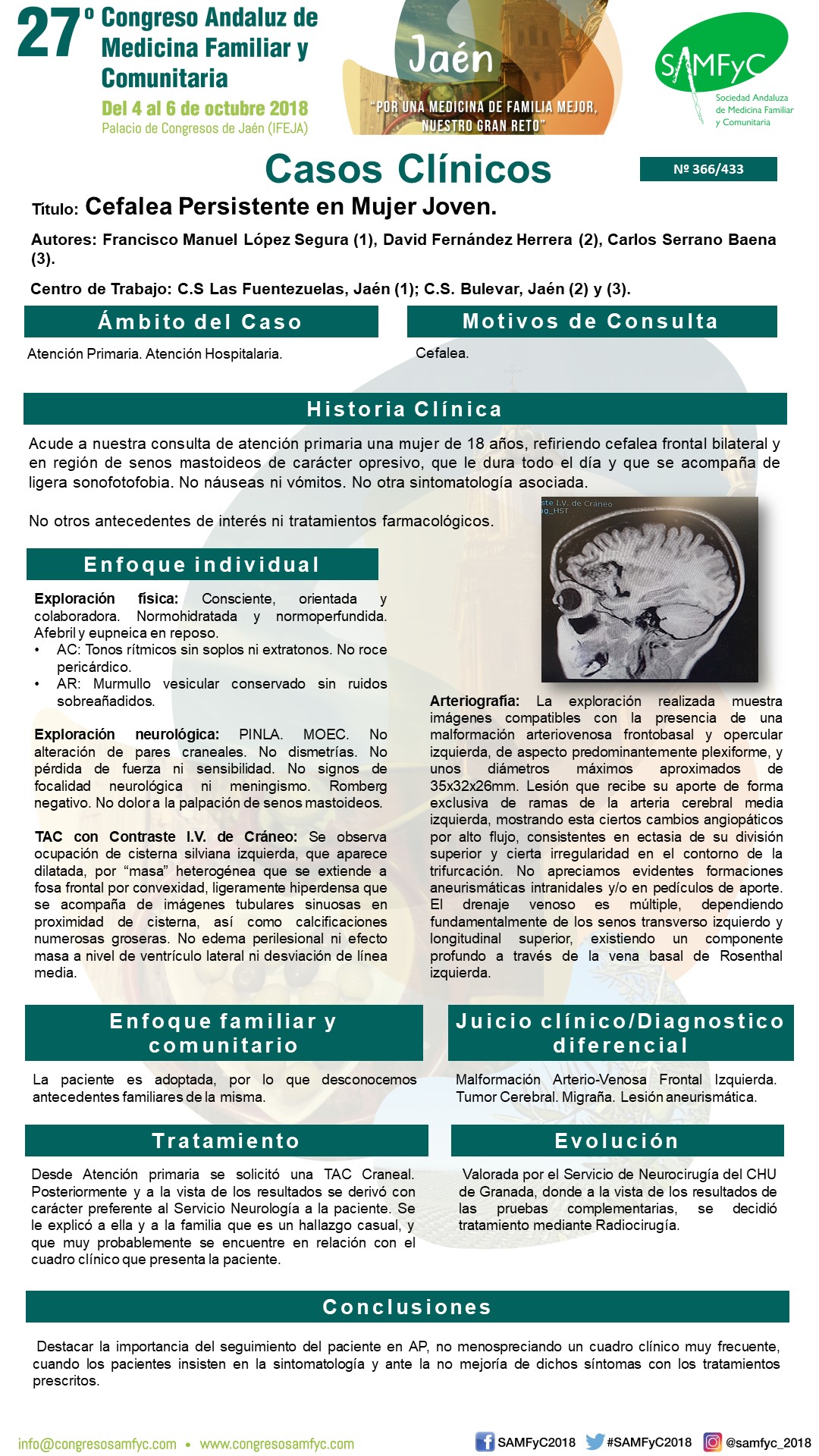 Valorada por el Servicio de Neurocirugía del CHU de Granada, donde a la vista de los resultados de las pruebas complementarias, se decidió tratamiento mediante Radiocirugía.