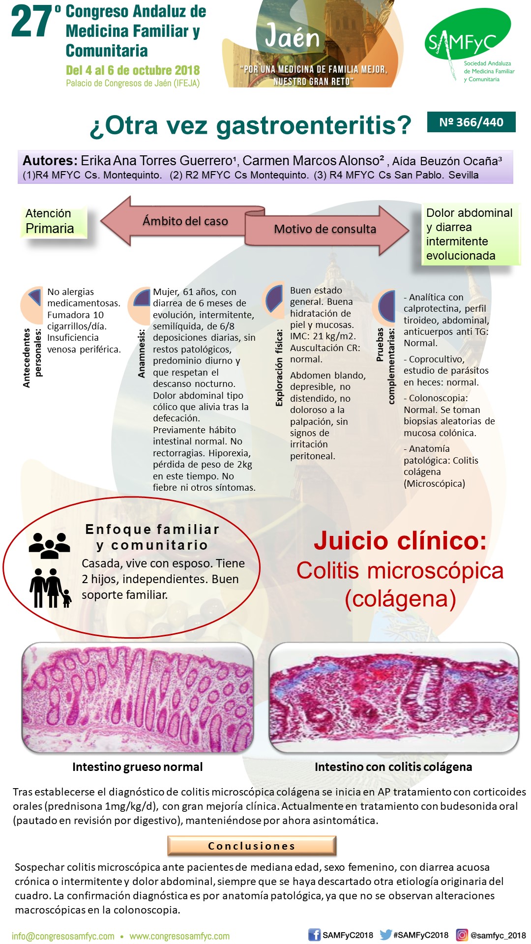 Mujer de 61 años, que presenta diarrea de 6 meses de evolución, intermitente, semilíquida, de 6/8 deposiciones diarias, sin restos patológicos, predominio diurno y que respetan el descanso nocturno. Dolor abdominal tipo cólico que alivia tras la defecación. Previamente hábito intestinal normal. No rectorragias. Hiporexia, pérdida de peso de 2 kg en este tiempo. No fiebre ni otros síntomas.