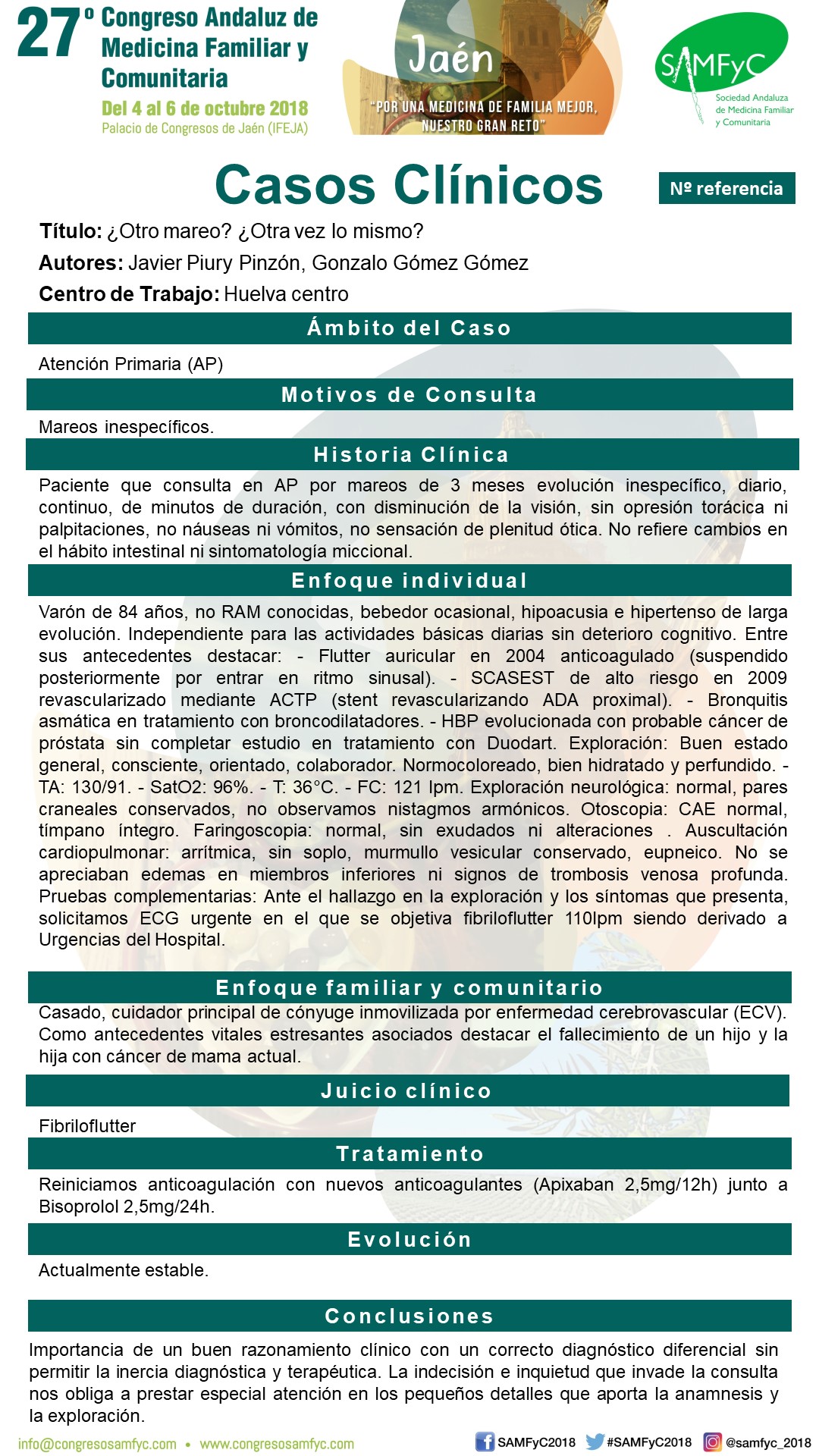 Varón de 84 años, no RAM conocidas, bebedor ocasional, hipoacusia e hipertenso de larga evolución. Independiente para las actividades básicas diarias sin deterioro cognitivo. Entre sus antecedentes destacar: - Flutter auricular en 2004 anticoagulado (suspendido posteriormente por entrar en ritmo sinusal). - SCASEST de alto riesgo en 2009 revascularizado mediante ACTP (stent revascularizando ADA proximal). - Bronquitis asmática en tratamiento con broncodilatadores. - HBP evolucionada con probable cáncer de próstata sin completar estudio en tratamiento con Duodart. Exploración: Buen estado general, consciente, orientado, colaborador. Normocoloreado, bien hidratado y perfundido. - TA: 130/91. - SatO2: 96%. - T: 36°C. - FC: 121 lpm. Exploración neurológica: normal, pares craneales conservados, no observamos nistagmos armónicos. Otoscopia: CAE normal, tímpano íntegro. Faringoscopia: normal, sin exudados ni alteraciones . Auscultación cardiopulmonar: arrítmica, sin soplo, murmullo vesicular conservado, eupneico. No se apreciaban edemas en miembros inferiores ni signos de trombosis venosa profunda. Pruebas complementarias: Ante el hallazgo en la exploración y los síntomas que presenta, solicitamos ECG urgente en el que se objetiva fibriloflutter 110lpm siendo derivado a Urgencias del Hospital.