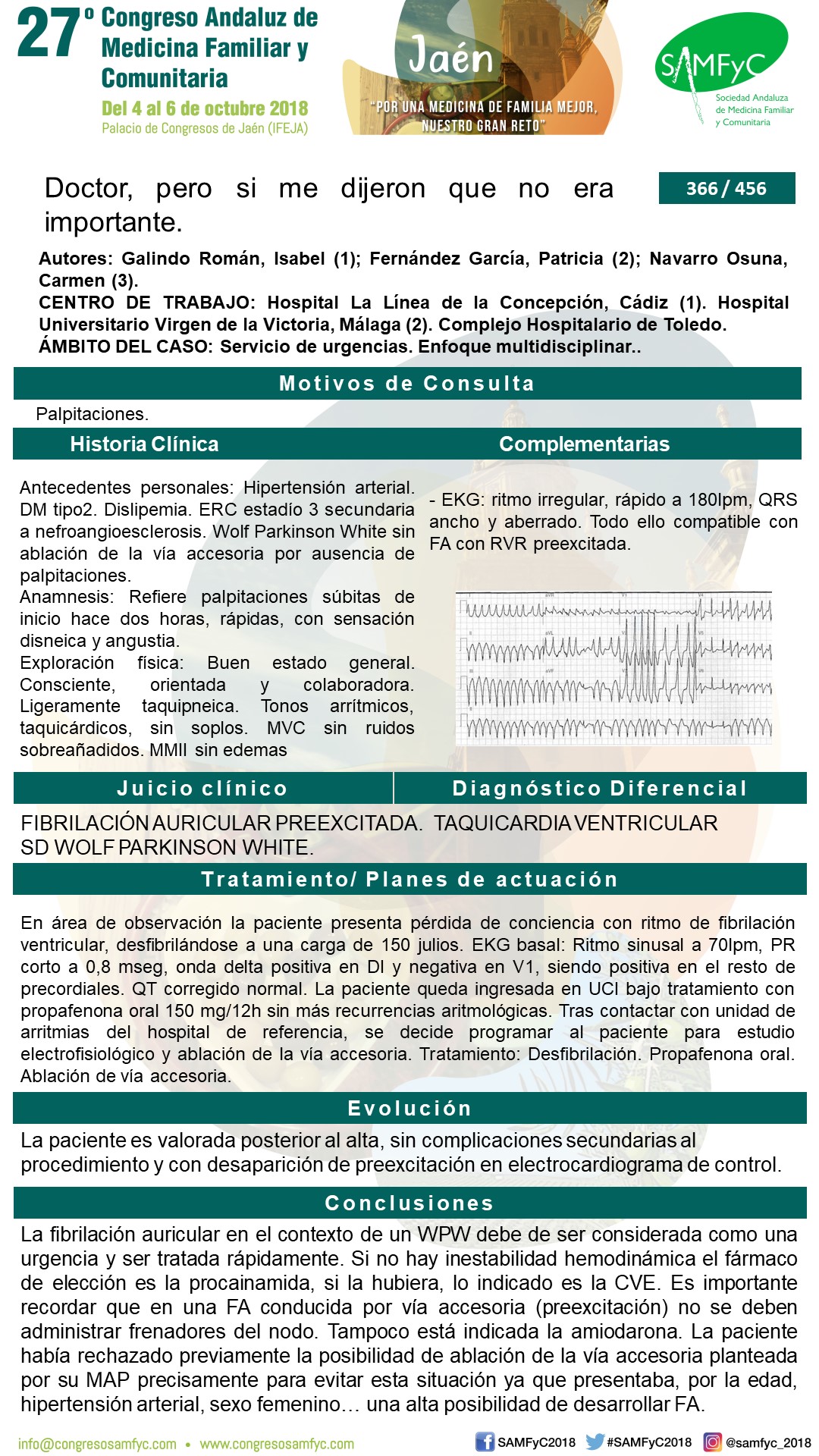 La paciente había rechazado previamente la posibilidad de ablación de la vía accesoria planteada por su MAP precisamente para evitar esta situación ya que presentaba, por la edad, hipertensión arterial, sexo femenino … una alta posibilidad de desarrollar FA.