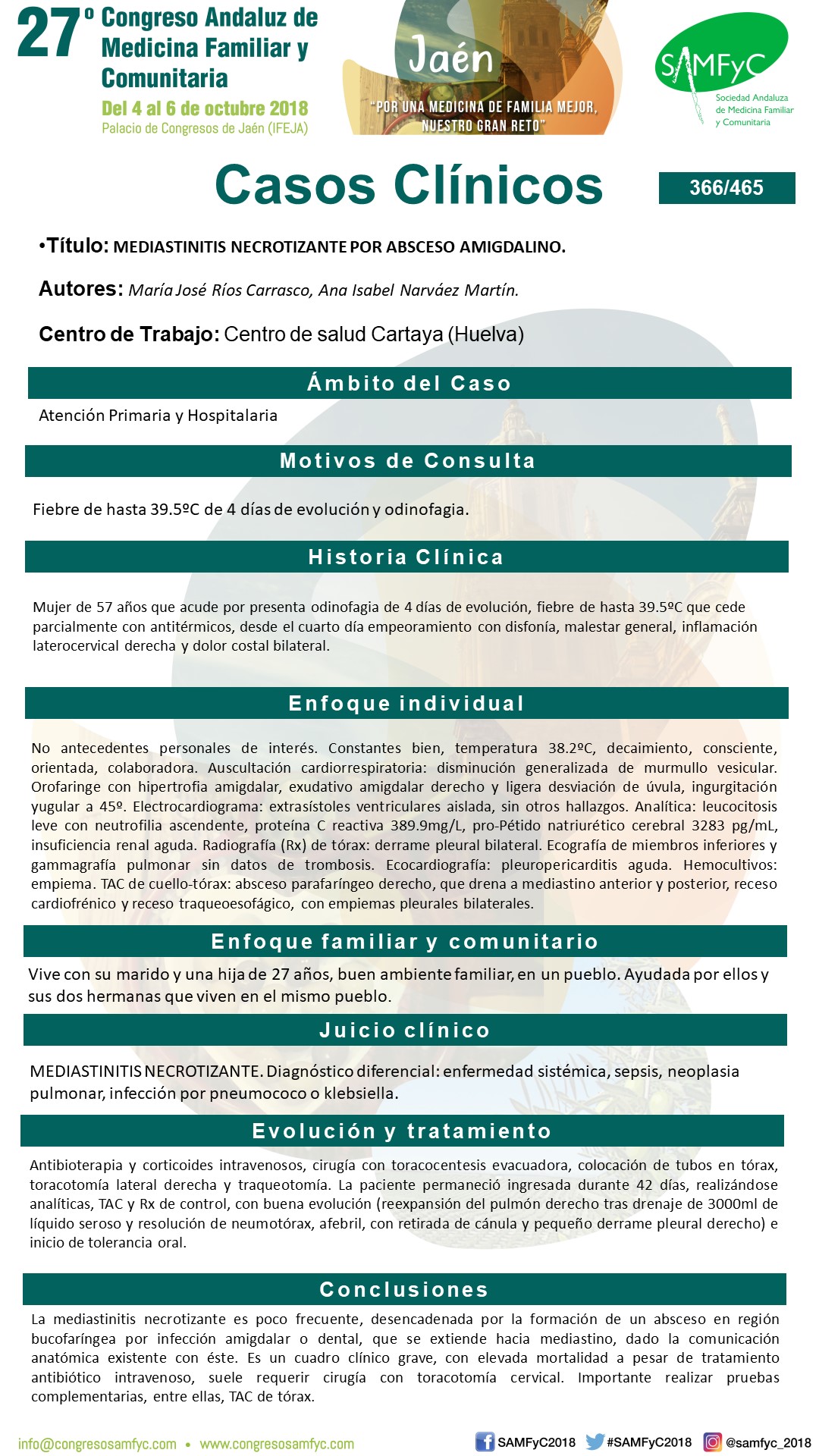 La mediastinitis necrotizante es poco frecuente, desencadenada por la formación de un absceso en región bucofaríngea por infección amigdalar o dental, que se extiende hacia mediastino, dado la comunicación anatómica existente con éste. Es un cuadro clínico grave, con elevada mortalidad a pesar de tratamiento antibiótico intravenoso, suele requerir cirugía con toracotomía cervical. Importante realizar pruebas complementarias, entre ellas, TAC de tórax.