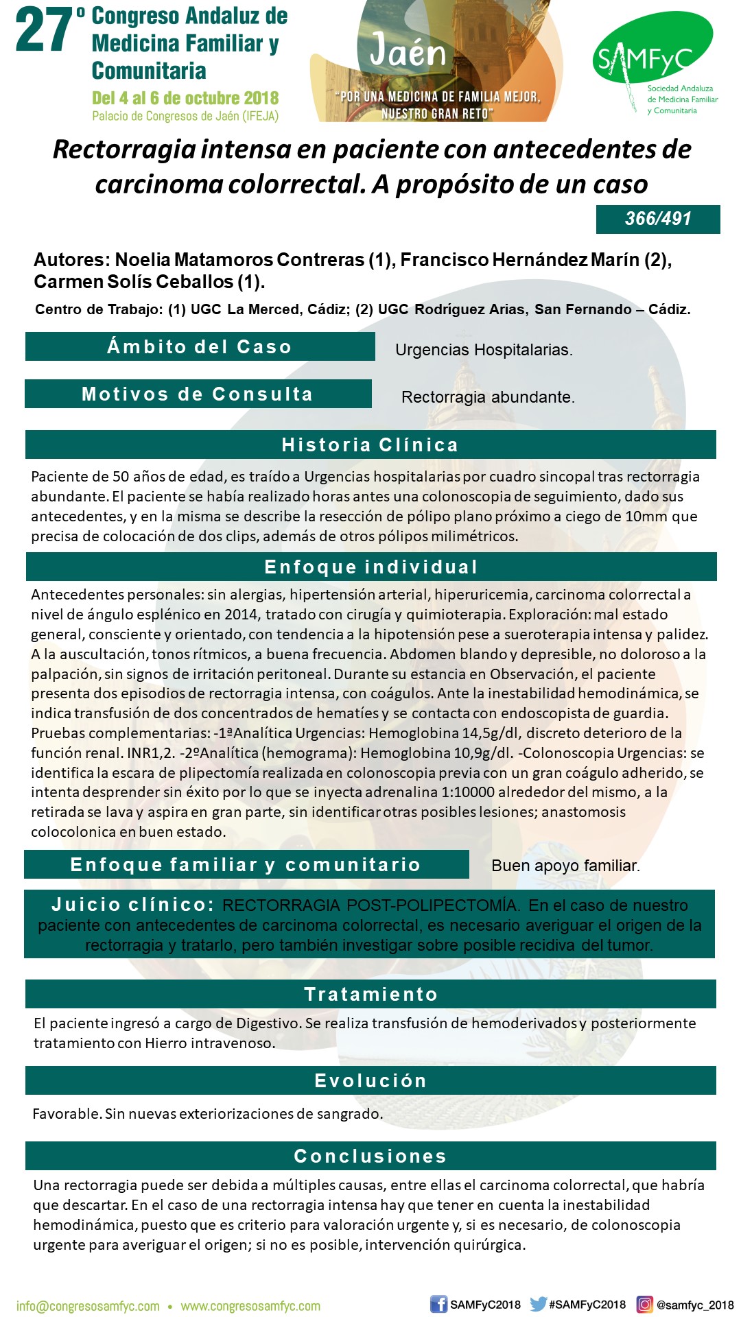 Una rectorragia puede ser debida a múltiples causas, entre ellas el carcinoma colorrectal, que habría que descartar. En el caso de una rectorragia intensa hay que tener en cuenta la inestabilidad hemodinámica, puesto que es criterio para valoración urgente y, si es necesario, de colonoscopia urgente para averiguar el origen; si no es posible, intervención quirúrgica.
