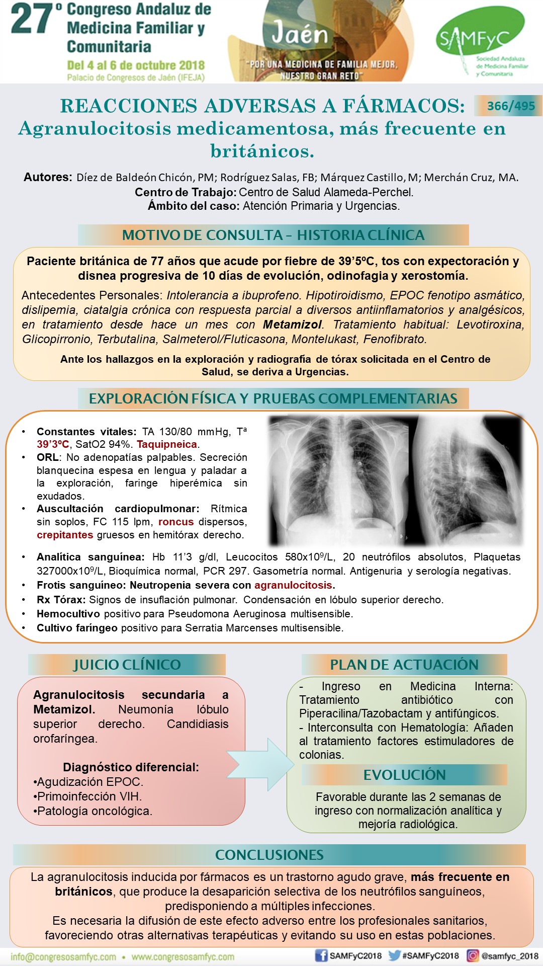 Juicio clínico: Agranulocitosis secundaria a Metamizol. Neumonía lóbulo superior derecho. Candidiasis orofaríngea. Diagnóstico diferencial: Agudización EPOC. Primoinfección VIH. Patología Oncológica.