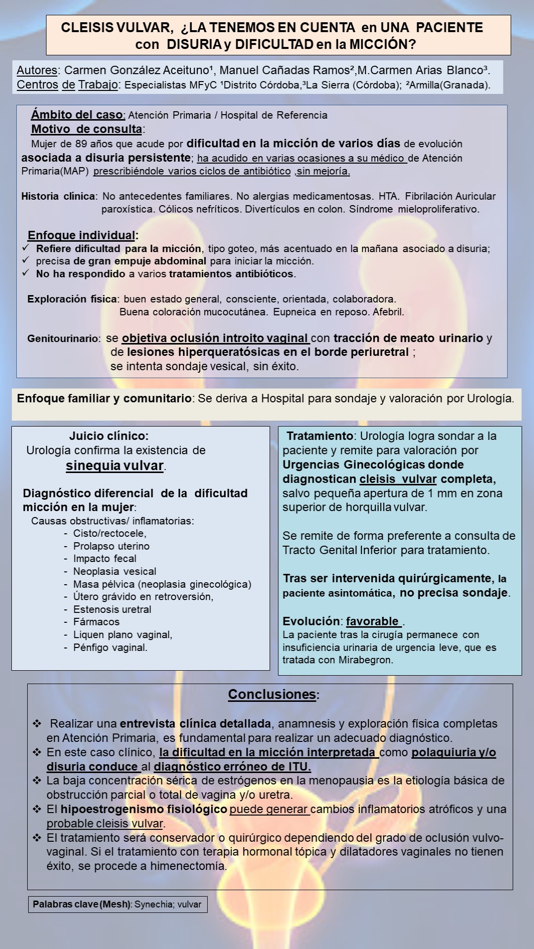 Realizar una entrevista clínica detallada,anamnesis y exploración física completas en Atención Primaria, es fundamental para realizar un adecuado diagnóstico.En este caso clínico, la dificultad en la micción interpretada como polaquiuria y/o disuria conduce al diagnóstico erróneo de ITU.La baja concentración sérica de estrógenos en la menopausia es la etiología básica de obstrucción parcial o total de vagina y/o uretra. El hipoestrogenismo fisiológico puede generar cambios inflamatorios atróficos y una probable cleisis vulvar. El tratamiento será conservador o quirúrgico dependiendo del grado de oclusión vulvo-vaginal. Si el tratamiento con terapia hormonal tópica y dilatadores vaginales no tienen éxito, se procede a himenectomía.