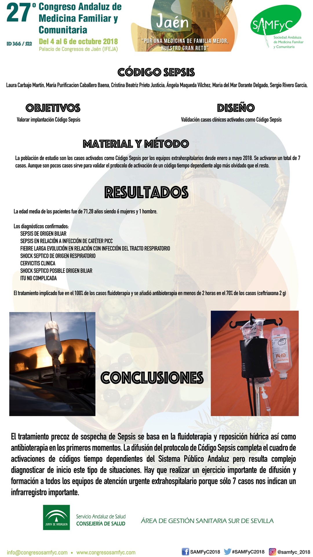 El tratamiento precoz de sospecha de Sepsis se basa en la fluidoterapia y reposición hídrica así como antibioterapia en los primeros momentos. La difusión del protocolo de Código Sepsis completa el cuadro de activaciones de códigos tiempo dependientes del Sistema Público Andaluz pero resulta complejo diagnosticar de inicio este tipo de situaciones. Hay que realizar un ejercicio importante de difusión y formación a todos los equipos de atención urgente extrahospitalario porque sólo 7 casos nos indican un infrarregistro importante.