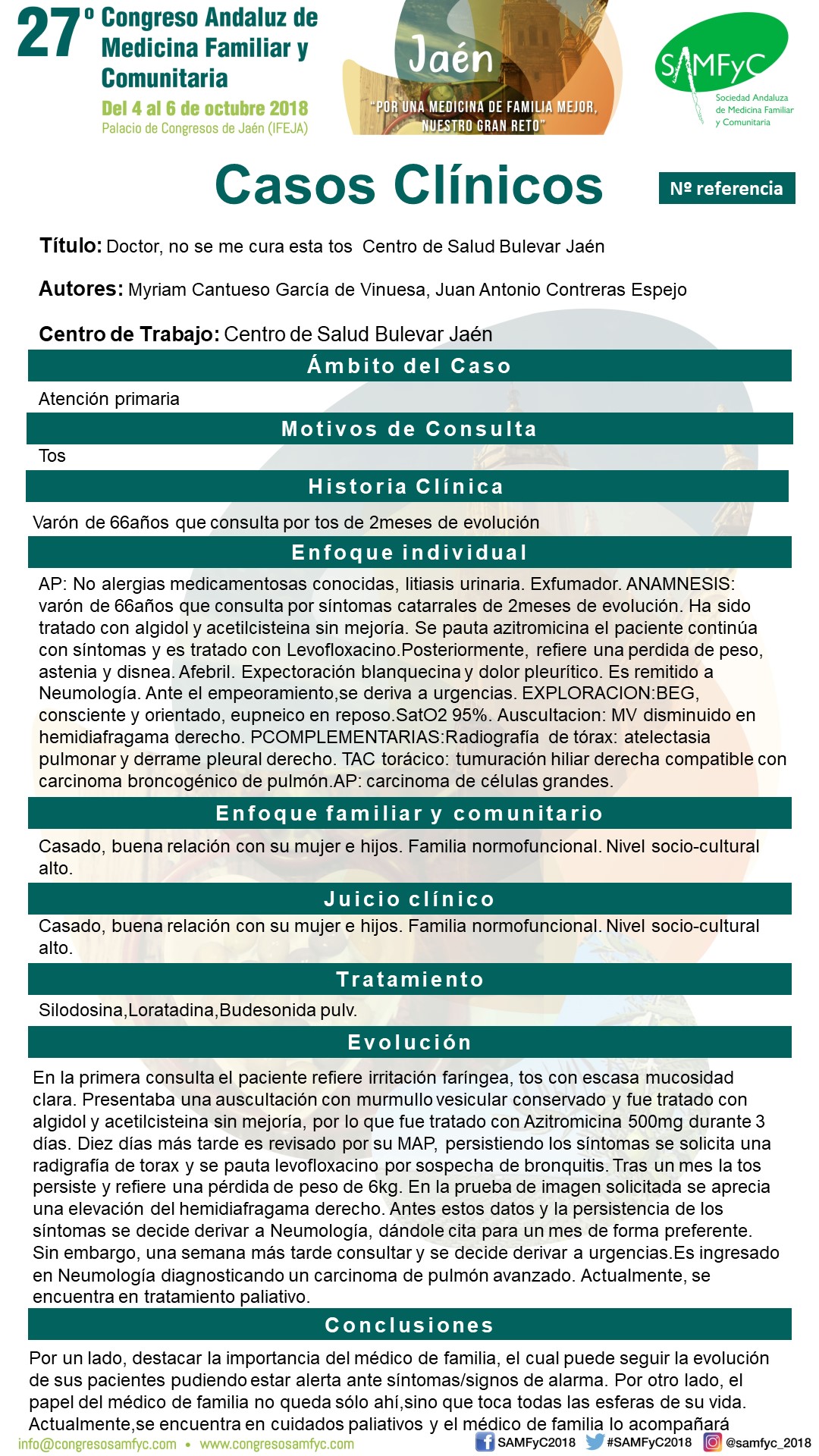 Tras un mes la tos persiste y refiere una pérdida de peso de 6kg. En la prueba de imagen solicitada se aprecia una elevación del hemidiafragama derecho. Antes estos datos y la persistencia de los síntomas se decide derivar a Neumología, dándole cita para un mes de forma preferente. Sin embargo, una semana más tarde consultar y se decide derivar a urgencias.Es ingresado en Neumología diagnosticando un carcinoma de pulmón avanzado. Actualmente, se encuentra en tratamiento paliativo.