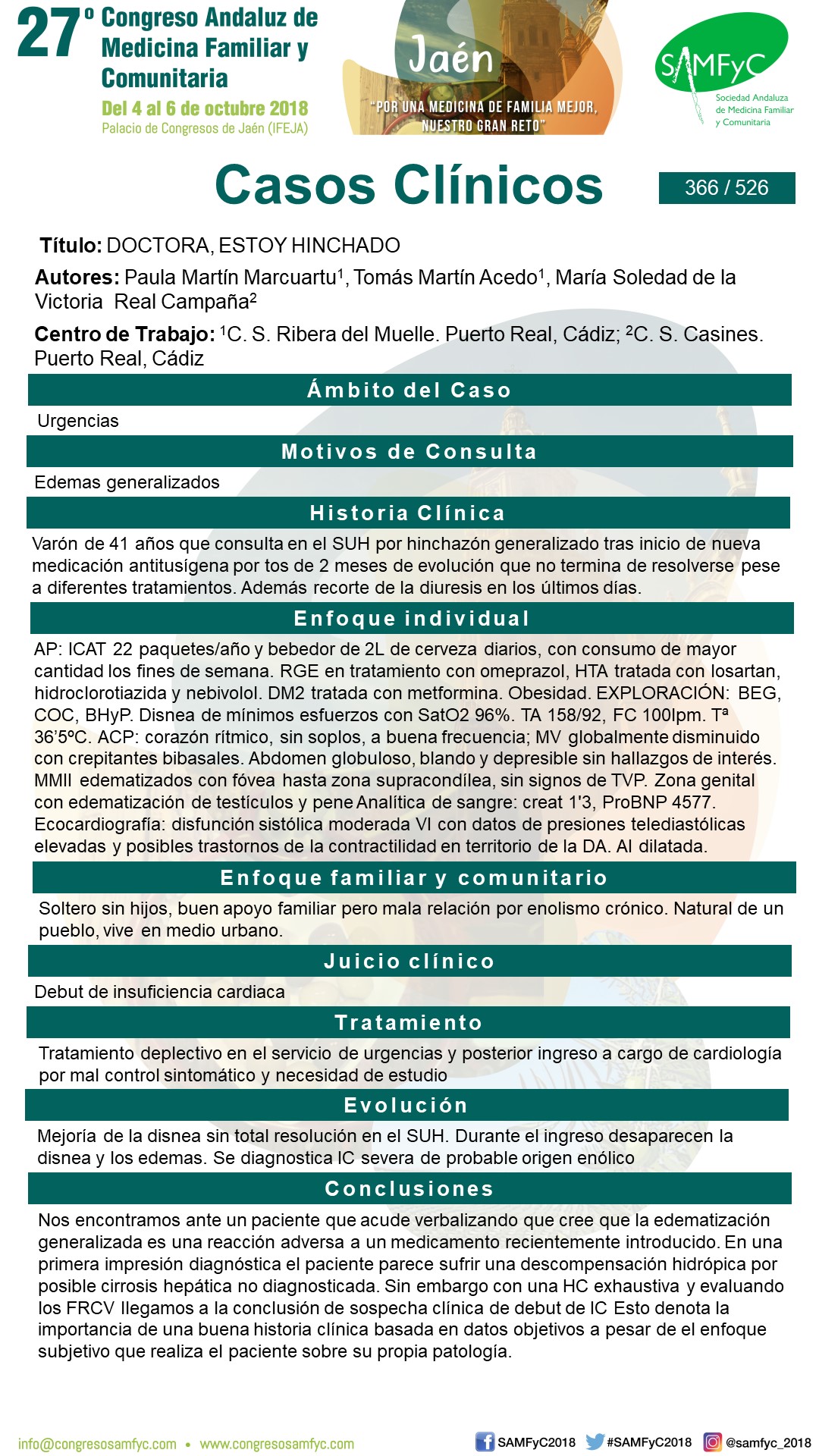 Nos encontramos ante un paciente que acude verbalizando que cree que la edematización generalizada es una reacción adversa a un medicamento recientemente introducido. En una primera impresión diagnóstica el paciente parece sufrir una descompensación hidrópica por posible cirrosis hepática no diagnosticada. Sin embargo con una HC exhaustiva y evaluando los FRCV llegamos a la conclusión de sospecha clínica de debut de IC