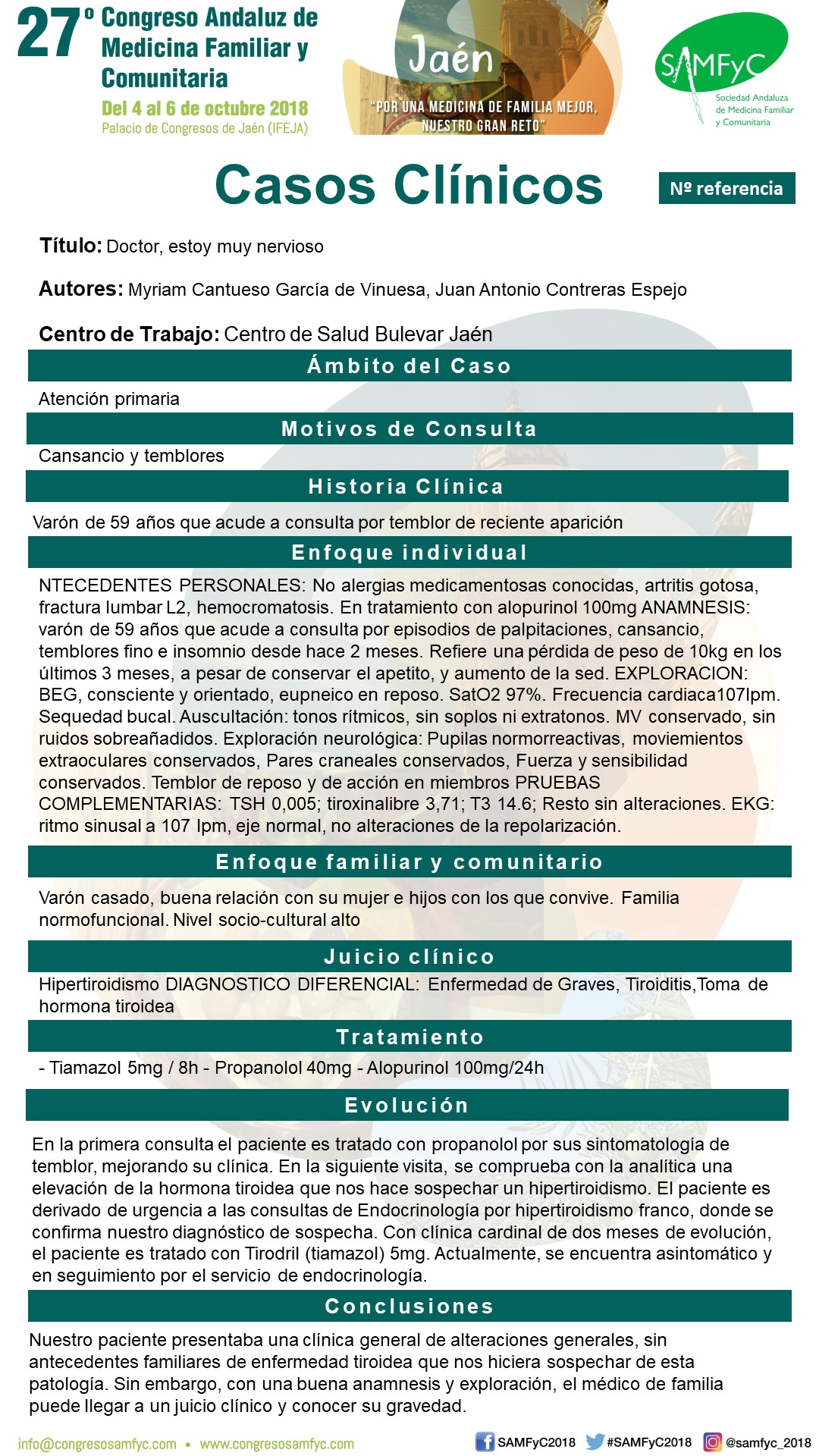 En la primera consulta el paciente es tratado con propanolol por sus sintomatología de temblor, mejorando su clínica. En la siguiente visita, se comprueba con la analítica una elevación de la hormona tiroidea que nos hace sospechar un hipertiroidismo.