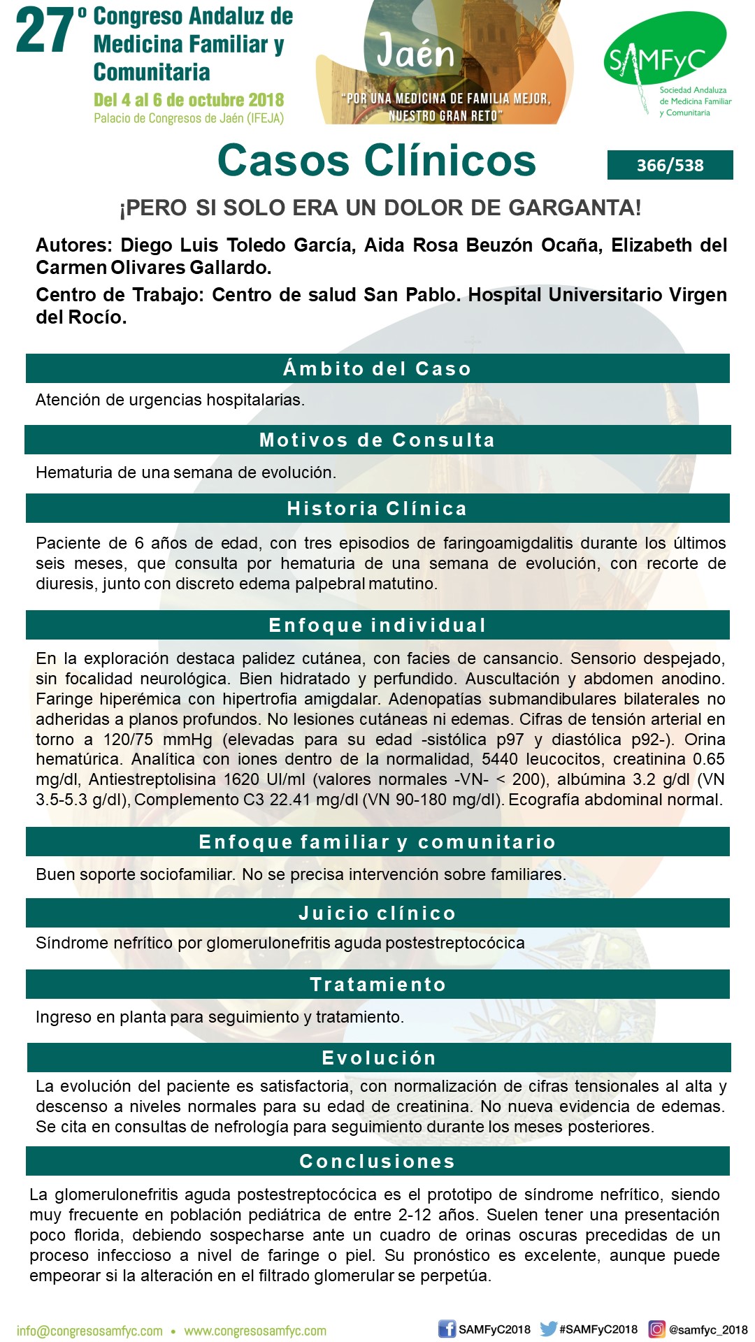 Paciente de 6 años de edad, con tres episodios de faringoamigdalitis durante los últimos seis meses, que consulta por hematuria de una semana de evolución, sin ninguna otra sintomatología salvo discreto edema palpebral matutino. Aunque no presentaba clínica urinaria, fue tratado inicialmente con Cefixima sospechando una infección del tracto urinario, aunque dado que no mejora vuelve a consultar de nuevo.