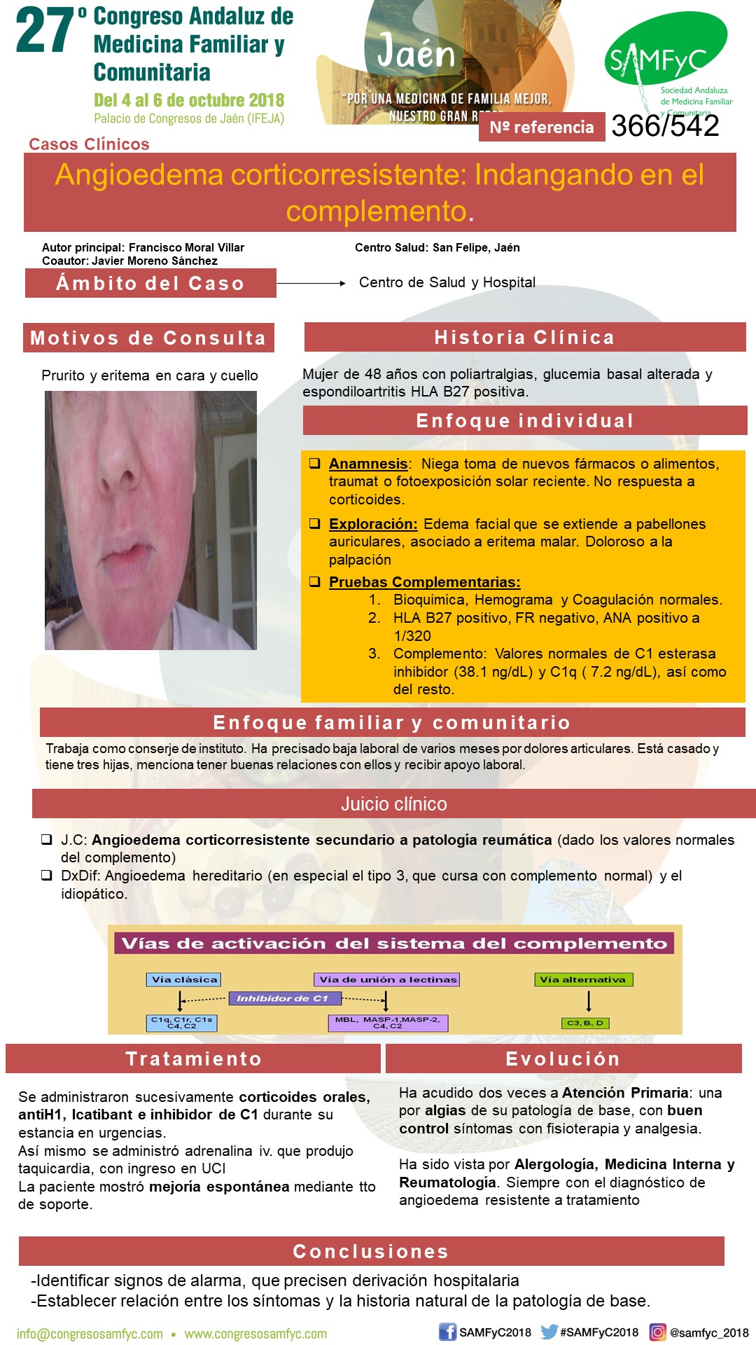 Ha acudido en dos ocasiones a la consulta de Atención Primaria, una por algias derivadas de su patología de base, que se han controlado satisfactoriamente con medicación y sesiones de fisioterapia. Ha sido vista por Alergología, Medicina Interna y Reumatologia siempre con el juicio clínico de Angioedema resistente a tratamiento (reumatología no especifica claramente que se deba a su patología reumática)