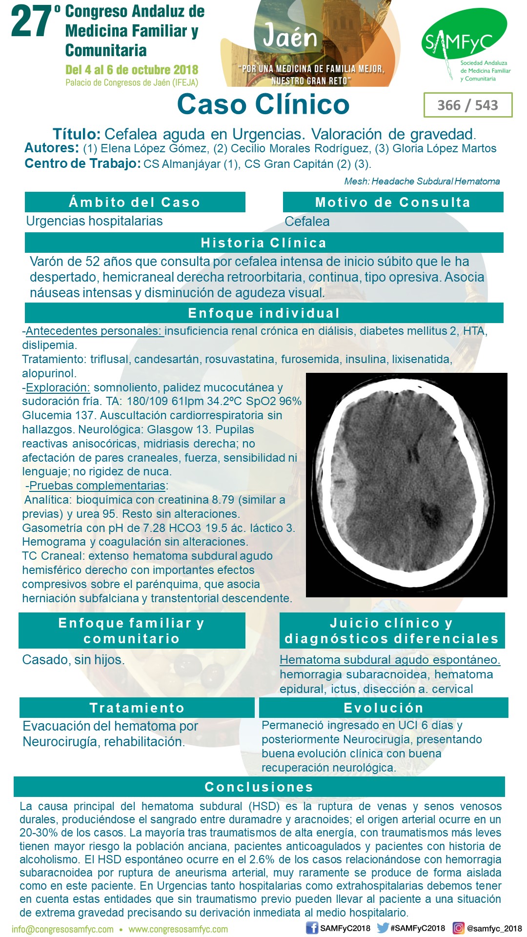 La causa principal del hematoma subdural (HSD) es la ruptura de venas y senos venosos durales, produciéndose el sangrado entre duramadre y aracnoides; el origen arterial ocurre en un 20-30% de los casos. La mayoría tras traumatismos de alta energía, con traumatismos más leves tienen mayor riesgo la población anciana, pacientes anticoagulados y pacientes con historia de alcoholismo. El HSD espontáneo ocurre en el 2.6% de los casos relacionándose con hemorragia subaracnoidea por ruptura de aneurisma arterial, muy raramente se produce de forma aislada como en este paciente. En Urgencias tanto hospitalarias como extrahospitalarias debemos tener en cuenta estas entidades que sin traumatismo previo pueden llevar al paciente a una situación de extrema gravedad precisando su derivación inmediata al medio hospitalario.