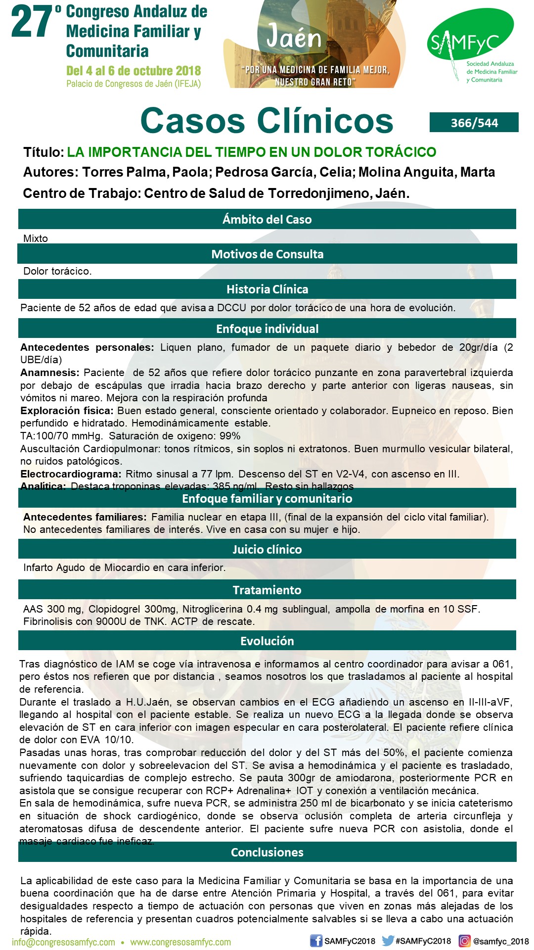 Pasadas unas horas, tras comprobar reducción del dolor y del ST más del 50%, el paciente comienza nuevamente con sobreelevación del ST. Se avisa a hemodinámica y el paciente es trasladado, sufriendo taquicardias de complejo estrecho. Se pauta 300gr de amiodarona. Posteriormente PCR en asistola que se recupera con RCP, Adrenalina, IOT y ventilación mecánica.