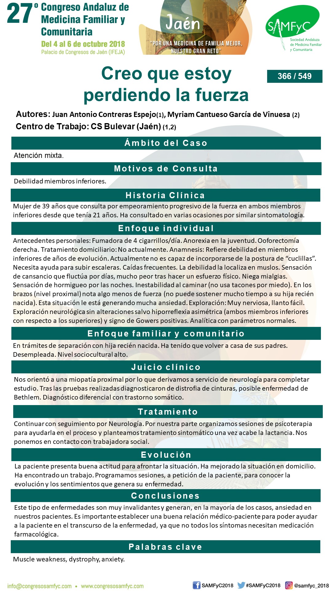 Anamnesis: Refiere debilidad en miembros inferiores de años de evolución. Actualmente no es capaz de incorporarse de la postura de “cuclillas ”. Necesita ayuda para subir escaleras. Caídas frecuentes. La debilidad la localiza en muslos. Sensación de cansancio que fluctúa por días, mucho peor tras hacer un esfuerzo físico. Niega mialgias. Sensación de hormigueo por las noches. Inestabilidad al caminar (no usa tacones por miedo). En los brazos (nivel proximal) nota algo menos de fuerza (no puede sostener mucho tiempo a su hija recién nacida). Esta situación le está generando mucha ansiedad.
