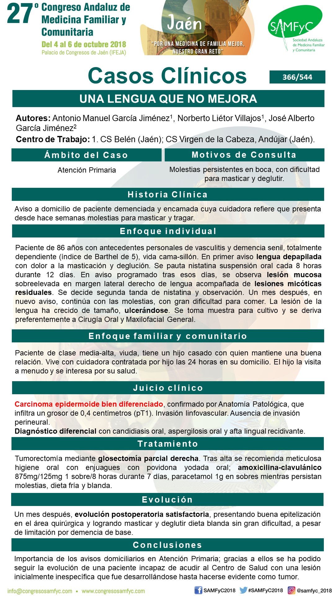 Paciente de 86 años con antecedentes personales de vasculitis y demencia senil, totalmente dependiente (índice de Barthel de 5), vida cama-sillón. En primer aviso lengua depapilada con dolor a la masticación y deglución. Se pauta nistatina suspensión oral cada 8 horas durante 12 días. En aviso programado tras esos días, se observa lesión mucosa sobreelevada en margen lateral derecho de lengua acompañada de lesiones micóticas residuales. Se decide segunda tanda de nistatina y observación. Un mes después, en nuevo aviso, continúa con las molestias, con gran dificultad para comer. La lesión de la lengua ha crecido de tamaño, ulcerándose. Se toma muestra para cultivo y se deriva preferentemente a Cirugía Oral y Maxilofacial General.