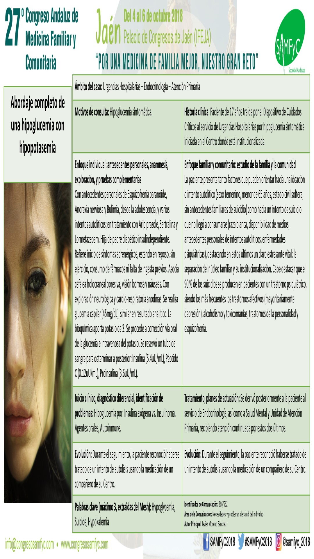 Con antecedentes personales de Esquizofrenia paranoide, Anorexia nerviosa y Bulimia, desde la adolescencia, y varios intentos autolíticos; en tratamiento con Aripiprazole, Sertralina y Lormetazepam. Hija de padre diabético insulindependiente. Refiere inicio de síntomas adrenérgicos, estando en reposo, sin ejercicio, consumo de fármacos ni falta de ingesta previos. Asocia cefalea holocraneal opresiva, visión borrosa y náuseas. Con exploración neurológica y cardio-respiratoria anodinas. Se realiza glucemia capilar (45mg/dL), similar en resultado analítico. La bioquímica aporta potasio de 3. Se procede a corrección vía oral de la glucemia e intravenosa del potasio. Se reservó un tubo de sangre para determinar a posterior: Insulina (5.4uU/mL), Péptido C (0.12uU/mL), Proinsulina (3.6uU/mL).