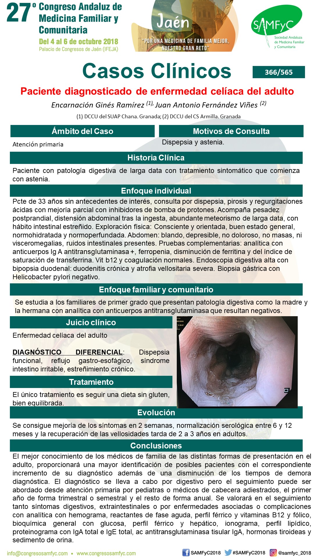 Pruebas complementarias: analítica con anticuerpos Ig A antitransglutaminasa +, ferropenia, disminución de ferritina y del índice de saturación de transferrina. Vit b12 y coagulación normales. Endoscopia digestiva alta con bipopsia duodenal: duodenitis crónica y atrofia vellositaria severa. Biopsia gástrica con Helicobacter pylori negativo.