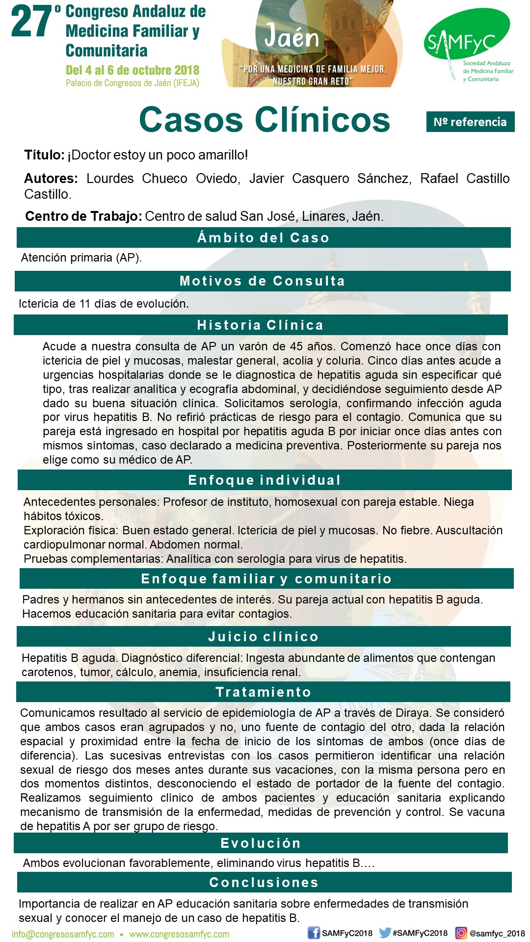 Acude a nuestra consulta de AP un varón de 45 años. Comenzó hace once días con ictericia de piel y mucosas, malestar general, acolia y coluria. Cinco días antes acude a urgencias hospitalarias donde se le diagnostica de hepatitis aguda sin especificar qué tipo, tras realizar analítica y ecografía abdominal, y decidiéndose seguimiento desde AP dado su buena situación clínica. En nuestra consulta solicitamos serología, confirmando infección aguda por virus hepatitis B. No refirió prácticas de riesgo para el contagio. Comunica que su pareja está ingresado en hospital por hepatitis aguda B por iniciar once días antes con los mismos síntomas, caso declarado a medicina preventiva. Posteriormente su pareja nos elige a nosotros como su médico de AP.