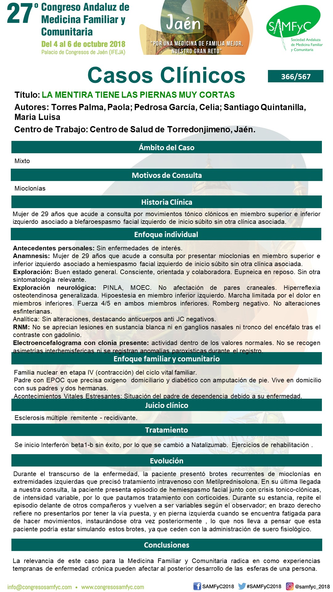 Durante el transcurso de la enfermedad, presentó brotes recurrentes de mioclonías en extremidades izquierdas precisando tratamiento intravenoso con Metilprednisolona. En sus últimos brotes vimos que la sintomatología tenía una intensidad variable y que cambiaba por segundos al estar o no presentes, desapareciendo la clínica justo al iniciar la sueroterapia, lo que nos hizo sospechar que estaba simulando los síntomas. Para comprobarlo, la siguiente vez se le pautó suero sin medicación, desapareciendo la clínica al inicio del tratamiento, lo que confirmó nuestra sospecha.