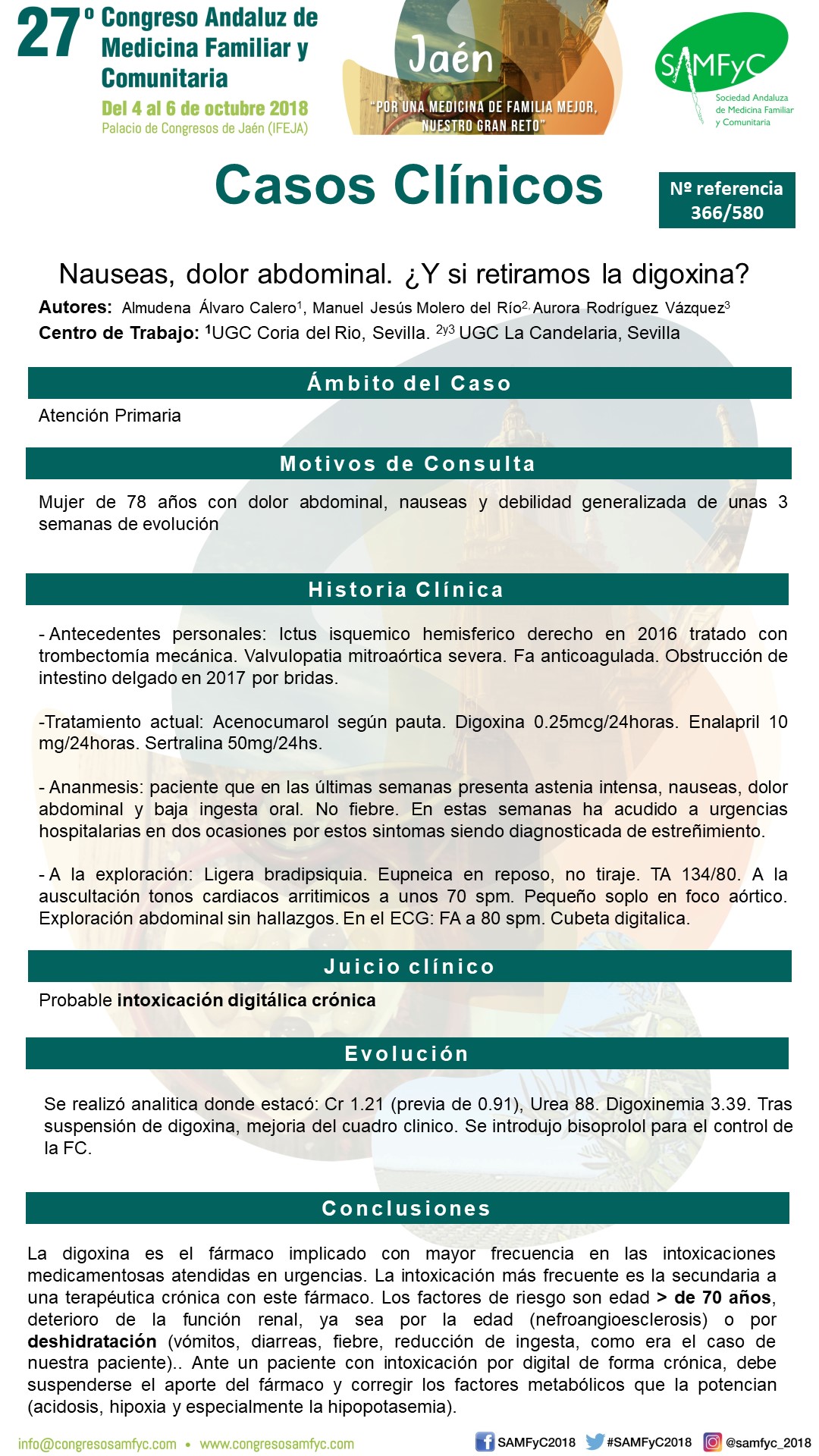 Dada la alta probabilidad de intoxicación digitálica crónica (sintomas inespecíficos en paciente mayor en tratamiento crónico con digoxina), la paciente fue derivada a urgencias hospitalarias para determinación de digoxinemia. En la analitica destacó: Cr 1.21 (previa de 0.91), Urea 88. Digoxinemia 3.39. No otras alteraciones.