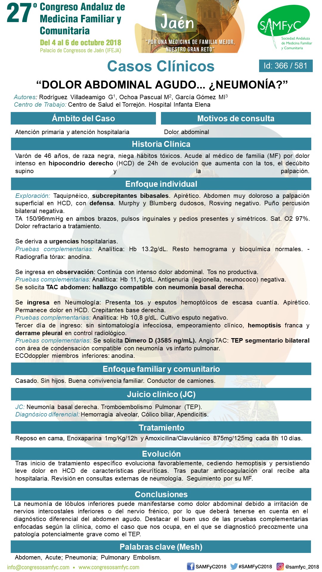 Destacar el buen uso de las pruebas complementarias enfocadas según la clínica, como el caso que nos ocupa, en el que se diagnosticó precozmente una patología potencialmente grave como el TEP.