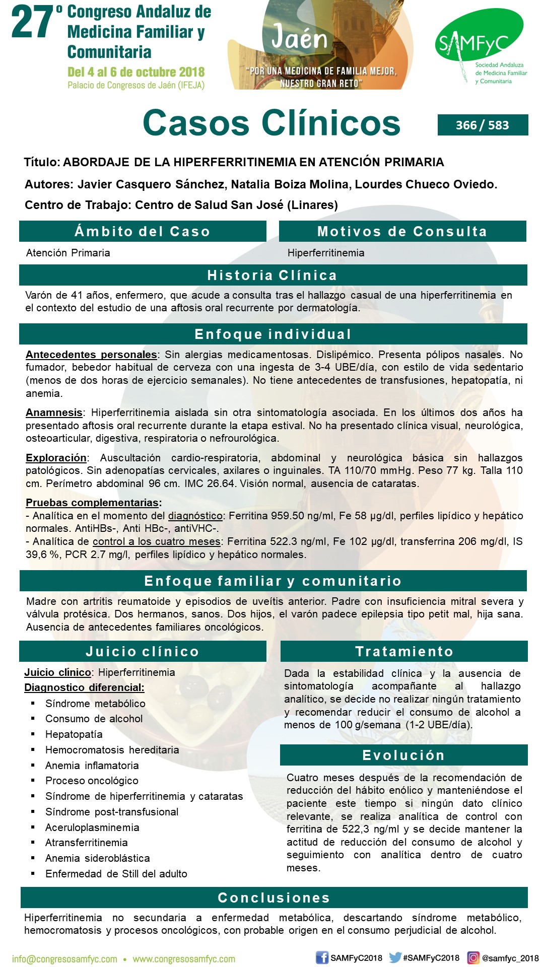 Cuatro meses después de la recomendación de reducción del hábito enólico y manteniéndose el paciente este tiempo si ningún dato clínico relevante, se realiza analítica de control con ferritina de 522,3 ng/ml y se decide mantener la actitud de reducción del consumo de alcohol y seguimiento con analítica dentro de cuatro meses.