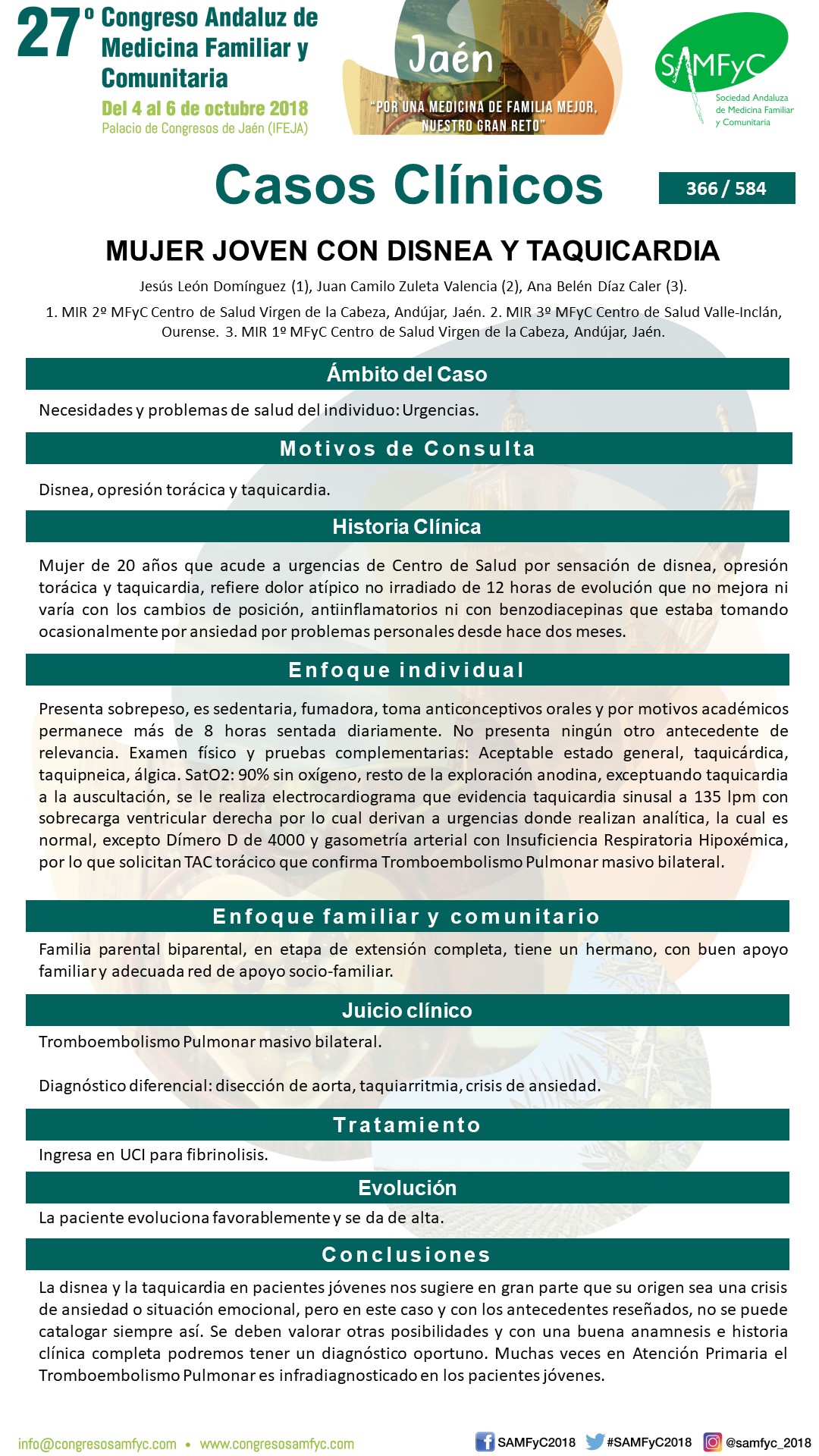 La disnea y la taquicardia en pacientes jóvenes nos sugiere en gran parte que su origen sea una crisis de ansiedad o situación emocional, pero en este caso y con los antecedentes reseñados, no se puede catalogar siempre así. Se deben valorar otras posibilidades y con una buena anamnesis e historia clínica completa podremos tener un diagnóstico oportuno. Muchas veces en Atención Primaria el tromboembolismo pulmonar es infradiagnosticado en los pacientes jóvenes.