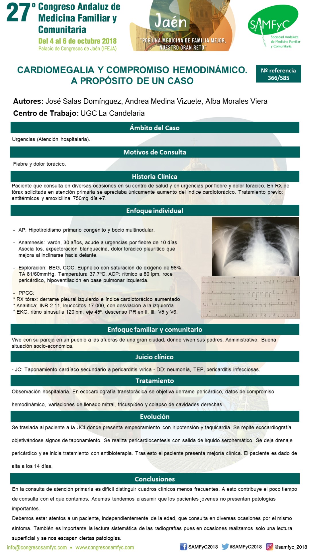 Paciente que consulta en diversas ocasiones en su centro de salud y en urgencias por fiebre y dolor torácico. En radiografía de tórax solicitada en atención primaria se apreciaba únicamente aumento del índice cardiotorácico, que no se describió.