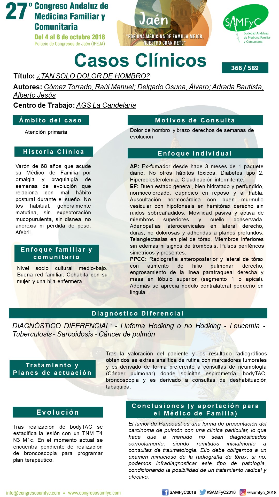 El tumor de Pancoast es una forma de presentación del carcinoma de pulmón con una clínica particular, lo que hace que a menudo no sean diagnosticados correctamente, siendo remitidos inicialmente a consultas de traumatología. Ello debe obligarnos a un examen minucioso de la radiografía de tórax, si no, podemos infradiagnosticar este tipo de patología, condicionando la posibilidad de un tratamiento radical y efectivo.