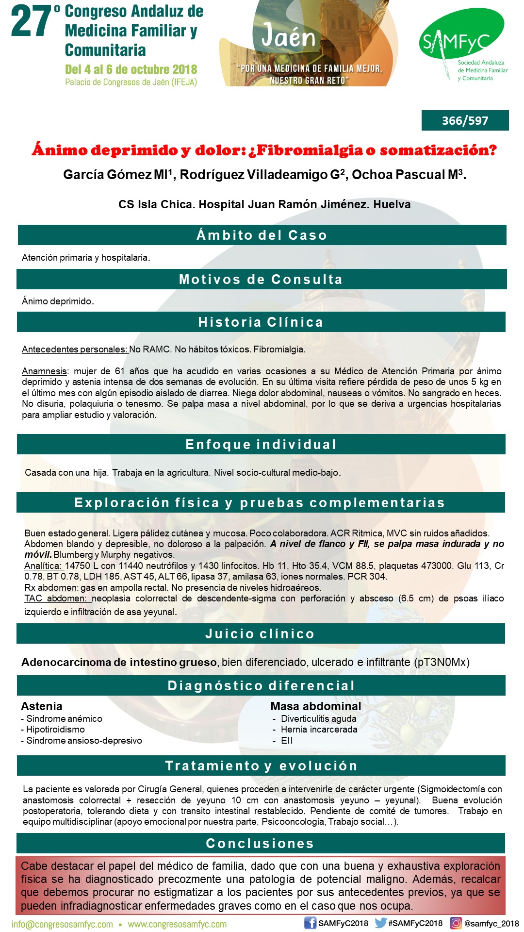Mujer de 61 años que ha acudido en varias ocasiones a su Médico de Atención Primaria por ánimo deprimido y astenia intensa de dos semanas de evolución. En su última visita refiere pérdida de peso de unos 5 kg en el último mes con algún episodio aislado de diarrea. Niega dolor abdominal, nauseas o vómitos. No sangrado en heces. No disuria, polaquiuria o tenesmo. Se palpa masa a nivel abdominal, por lo que se deriva a urgencias hospitalarias para ampliar estudio y valoración.