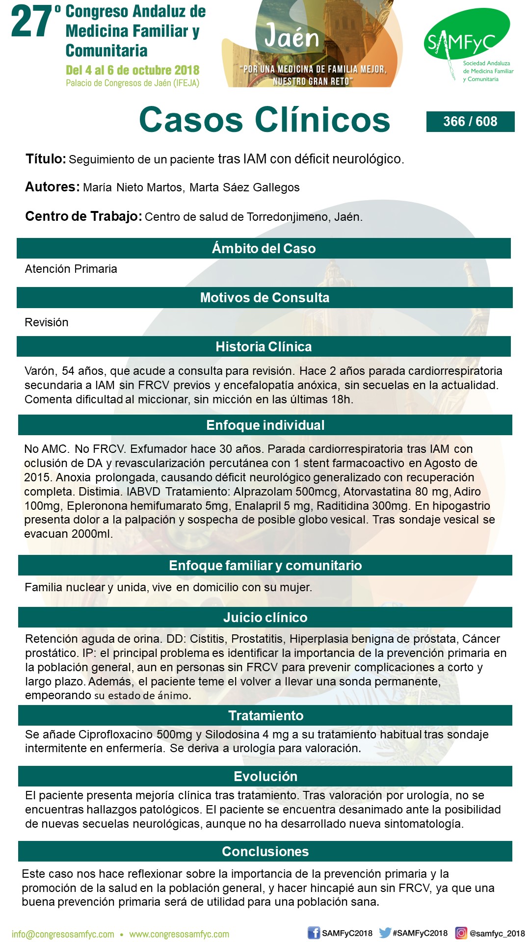 Varón, 54 años, que acude a consulta para revisión. Hace 2 años parada cardiorrespiratoria secundaria a IAM sin FRCV previos y encefalopatía anóxica, sin secuelas en la actualidad. Comenta dificultad al miccionar, sin micción en las últimas 18h.
