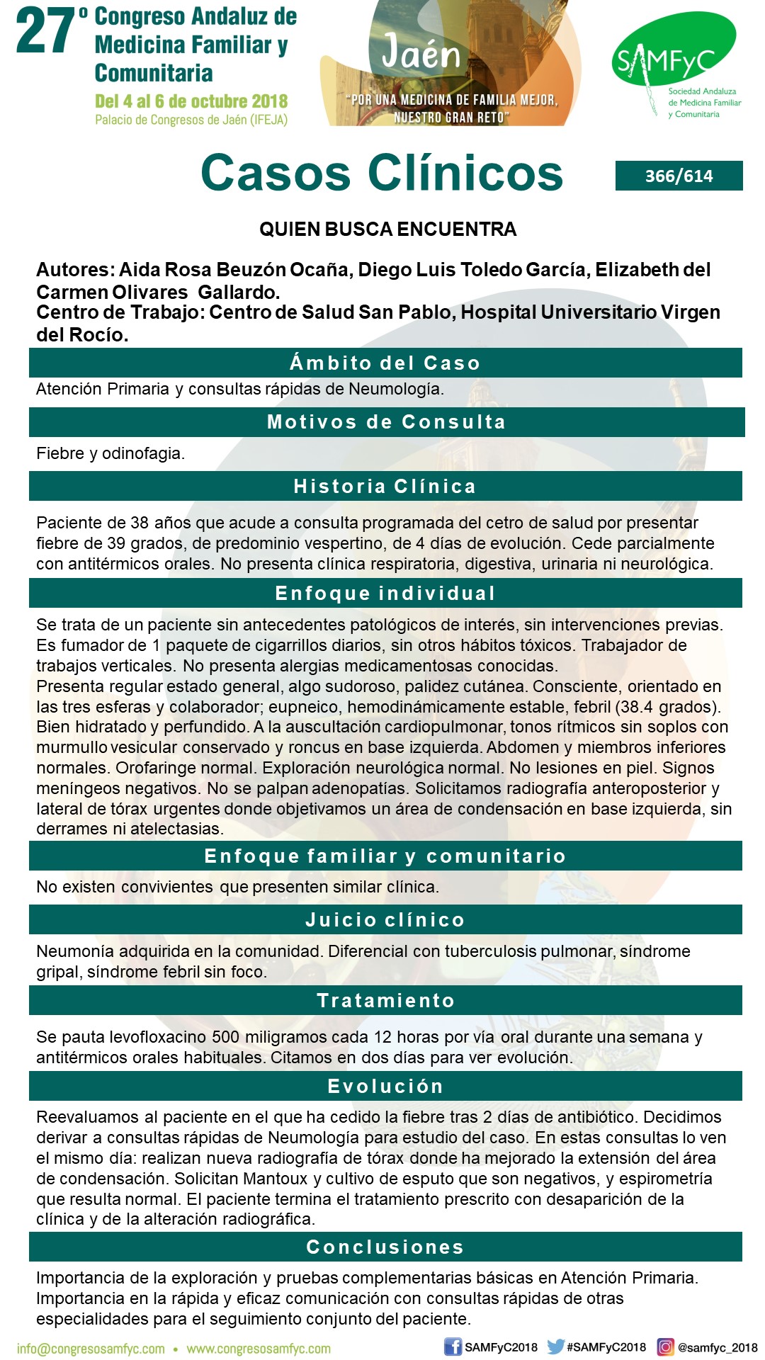 Paciente de 38 años que acude a consulta programada del centro de salud por presentar fiebre de 39 grados, de predominio vespertino, de 4 días de evolución. Cede parcialmente con antitérmicos orales. No presenta clínica respiratoria, digestiva, urinaria ni neurológica.