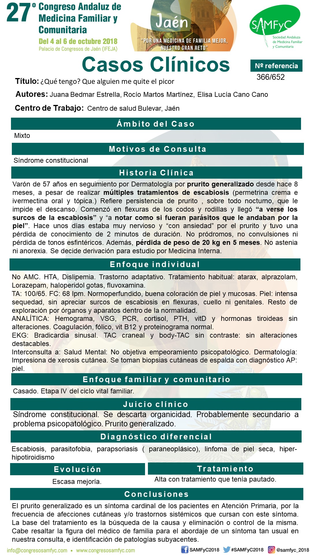 Varón de 57 años en seguimiento por Dermatología por prurito generalizado desde hace 8 meses, a pesar de realizar múltiples tratamientos de escabiosis (permetrina crema e ivermectina oral y tópica.) Refiere persistencia de prurito , sobre todo nocturno, que le impide el descanso. Comenzó en flexuras de los codos y rodillas y llegó “a verse los surcos de la escabiosis ” y “a notar como si fueran parásitos que le andaban por la piel ”.